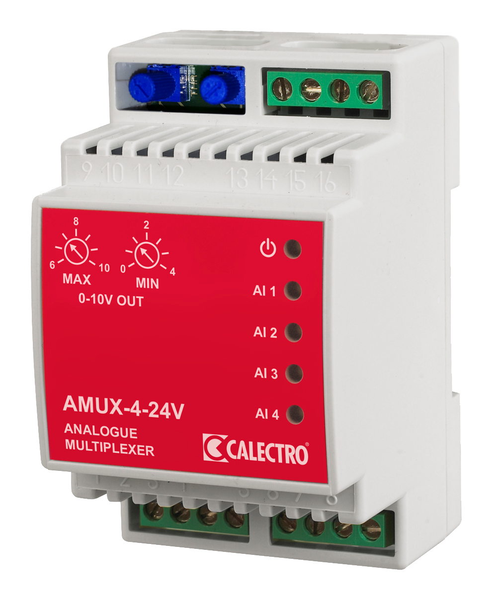 AMUX är en signalväljare för upp till fyra 0-10V signaler. Den har fyra 0-10V ingångar och en 0-10V utgång. Utgångssignalen blir samma som den högsta ingångssignalen. Det finns även en MIN- och MAX-inställning för utgångssignalen. MIN är ställbar mellan 0-4V och MAX är ställbar mellan 6-10V.